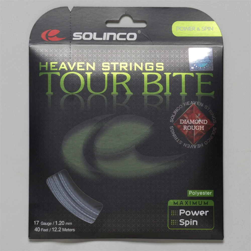 Solinco Tour Bite Diamond Rough 17 1.20 tennis string is the newest in the flagship Tour Bite line, designed to deliver maximum power and spin. The Diamond Rough texturing process generates extreme power and intense spin, and bite. With an innovative composition, youll experience better ball pocketing, feel and higher playability.